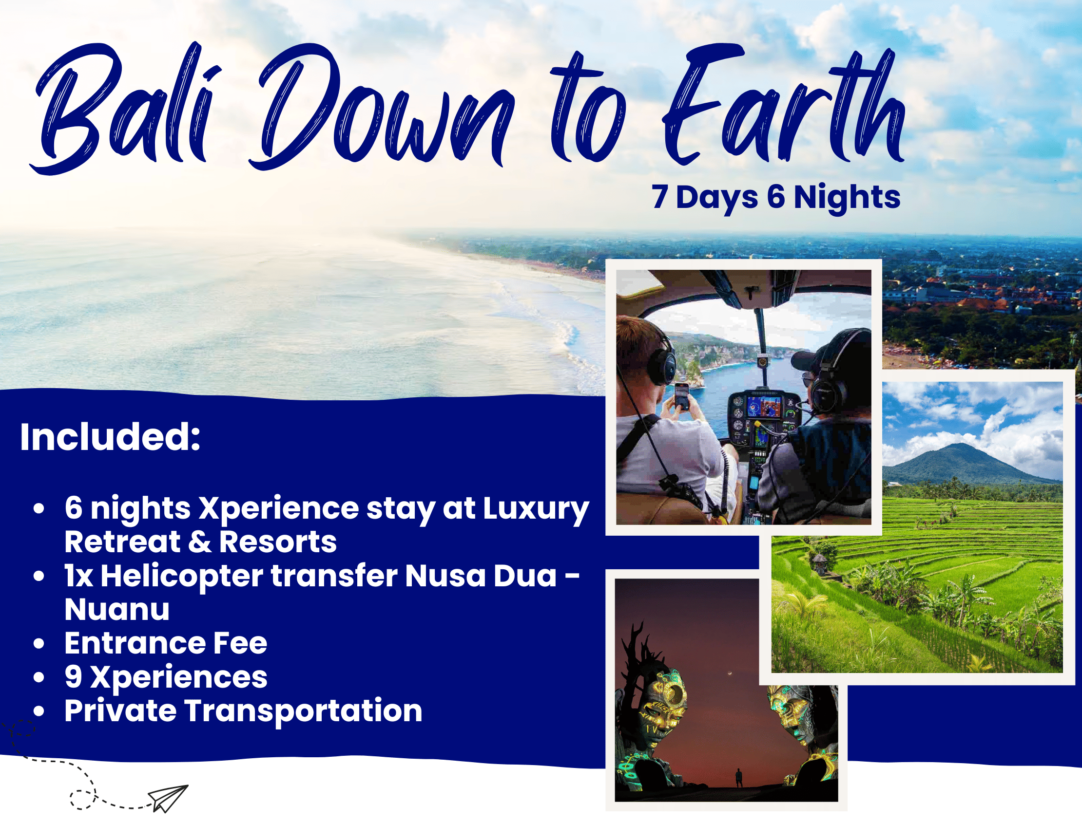 Embark on a week-long journey that blends aerial arrival, authentic culture, sustainable living, and transformative wellness in Bali’s most inspiring settings. From helicopter views of the island’s coastlines to sacred water blessings, creative workshops, and soul-nourishing retreats, each day offers a unique blend of adventure and serenity.