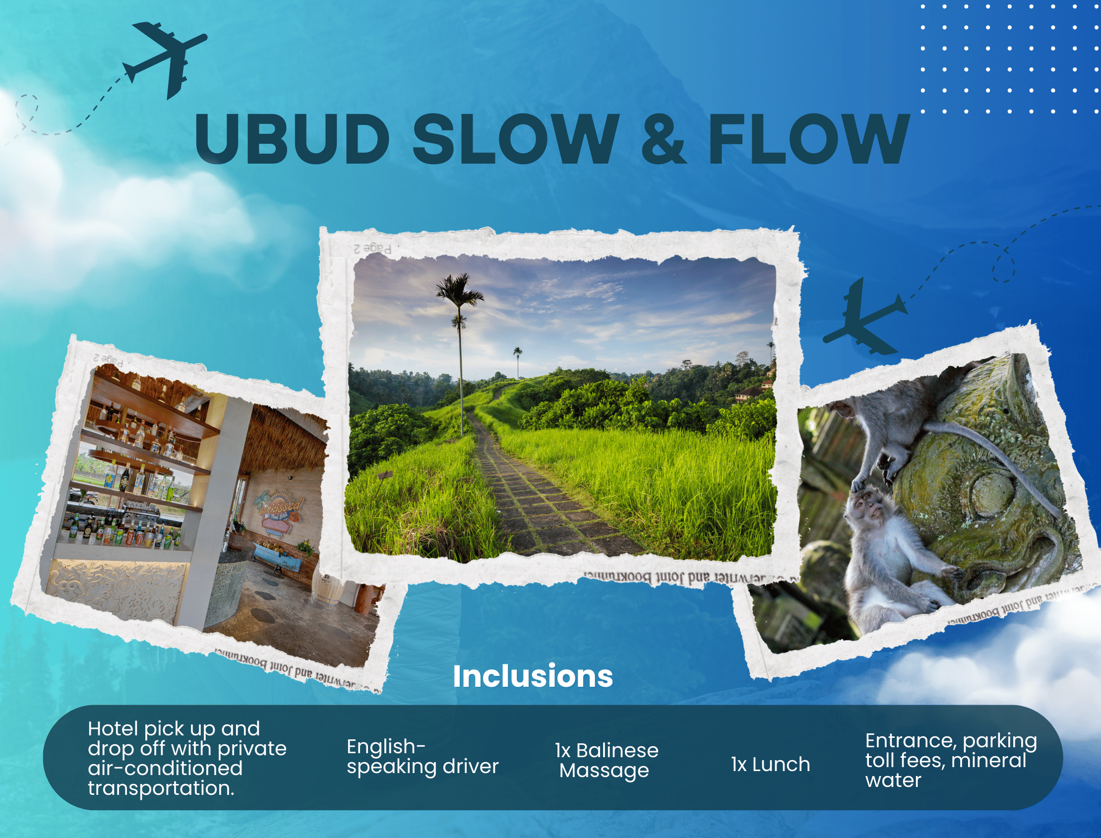 Experience Ubud with a ridge trek, Balinese massage, lunch, and cultural sightseeing before returning.